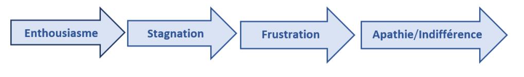 - Diminution du sens de l’accomplissement de la réalisation de soi : dévalorisation de soi, sentiment d’inefficacité, le travailleur se sent dans une impasse